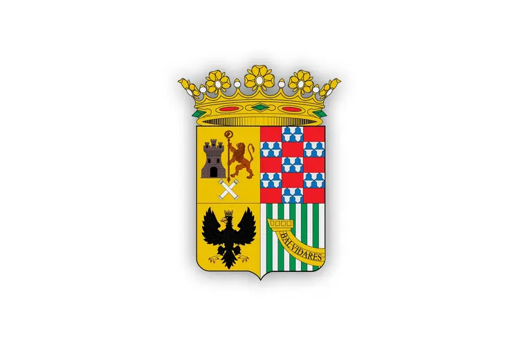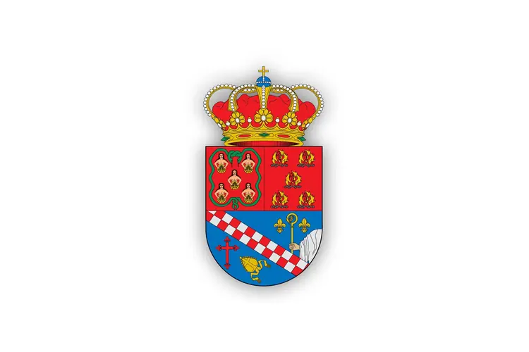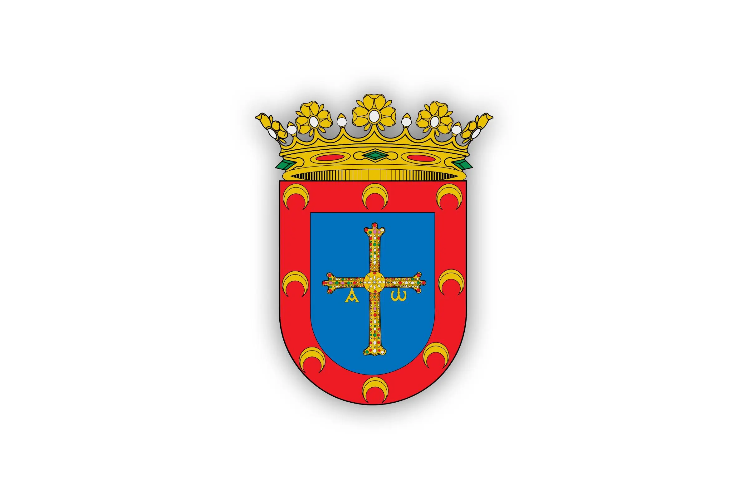 Datos básicos | Allande | En azur (color azul), la Cruz de la Victoria de oro y piedras preciosas, con las letras griegas Alfa mayúscula y Omega minúscula, ambas de oro y colgadas de sus brazos. Bordura de ocho menguantes de oro, con corona real abierta. La bordura cargada de menguantes significa la participación de los allandeses en la batalla del Salado contra los musulmanes, el 30 de octubre de 1340. El menguante es el símbolo del Islam pero con las