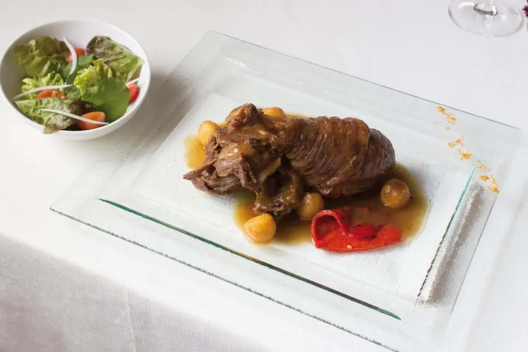 Restaurantes | Oviedo | Precio Medio: 50 €. Horario: abierto de 13:00 a 15:30 h. y de 21:00 a 23:30 h. Tipo de Cocina: asturiana contemporánea y tradicional. Especialidades: pulpo asado en velo ibérico y cremoso de pimentón y patata. Un lugar tranquilo y agradable de exquisita cocina y trato. Nueve mesas dispuestas en un acogedor salón. Características: Menús especialesMenú del díaCateringAire acondicionadoMenús para gr