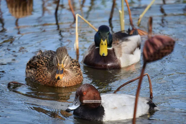 Flora y fauna | Oviedo | Ánade Real: Pato de tamaño grande de 45 a 55 cm. El macho tiene la cabeza y el cuello verde oscuro brillante, collar blanco, pecho castaño rojizo, alas pardo tostado y gris, espejuelo azul violeta bordeado de blanco y negro y pico amarillento. La hembra, sin embargo, es parda. Crían en parejas cerca de agua, embalses y lagos. Se pueden encontrar fundamentalmente en el Embalse de Serín (Gijón), Embalse de Rioseco (Sob