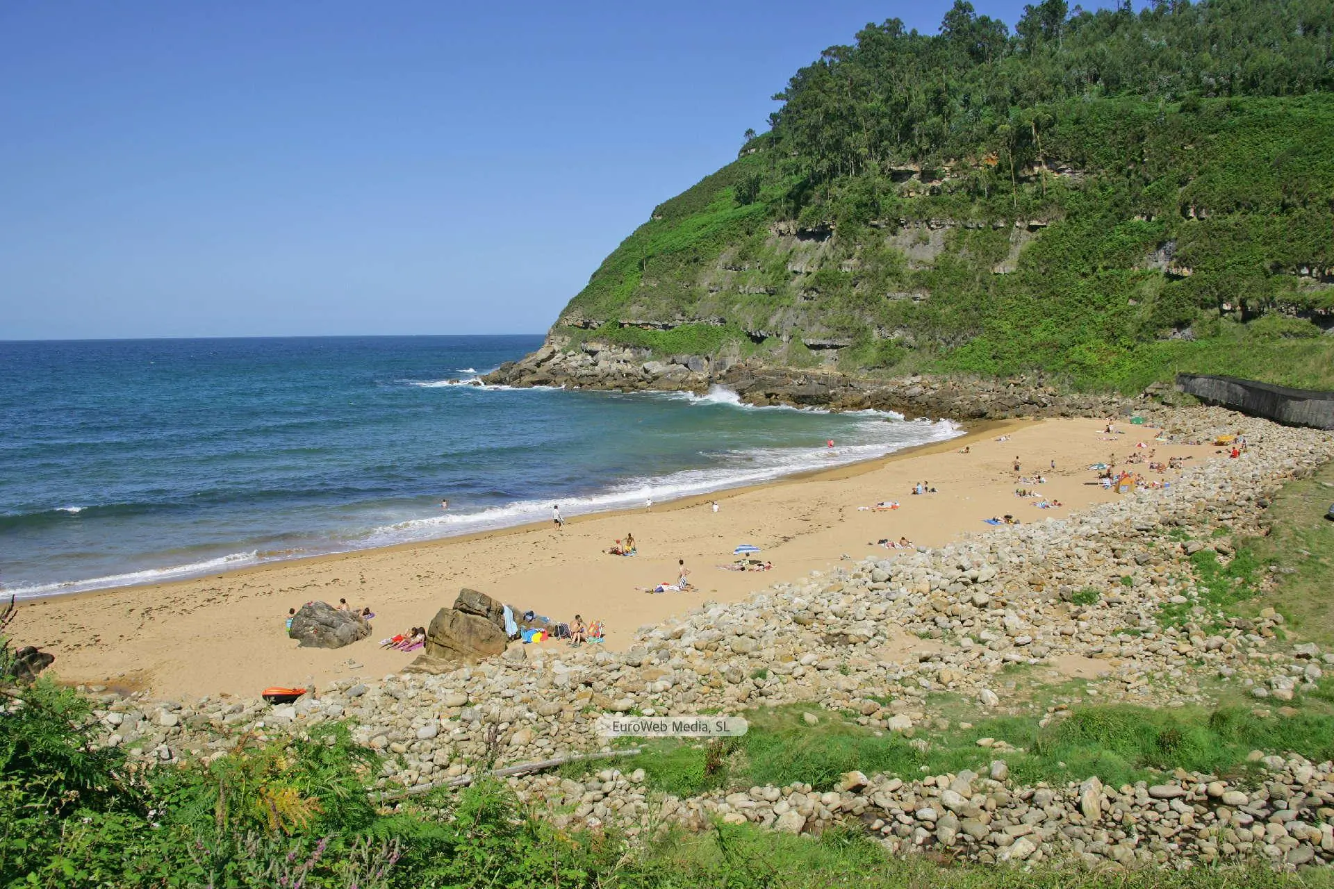 Playas | Villaviciosa | Semejante en cuanto a sus peculiaridades a las de La Ñora y España, la playa de Merón ve reducida la cifra de visitantes como consecuencia directa de la complicación que entraña llegar a ella. Debido a las vulneraciones sufridas por el mar anteriormente, el río Merón, que desemboca en esta playa, queda prácticamente «descolgado». Se acostumbra a practicar el nudismo. Características generales