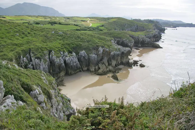 Playas | Llanes | Características. Ocupación: Media. Longitud aproximada: 30 m Accesos: A pie, dificultosos. Servicios: Aparcamiento: No. Socorrismo: No. Material: Arena gruesas, cantos, afloramientos rocosos calizos. Color: Blanquecino (arena). Forma: Pequeño cañón (dolina capturada por el mar). Desembocadura fluvial: Ninguna. Entorno: Rural. Tipo de playa: Oleaje medio. Atractivos: Paisajísticos, geológicos y recreativos. Pelig