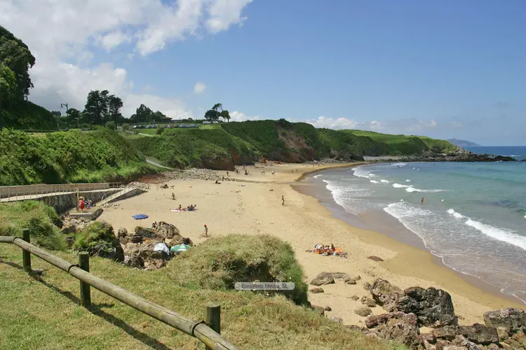 Playas | Llanes | El arenal de La Huelga se halla en la vaguada que el río San Cecilio forma en su desembocadura —prolongándose aguas arriba—, donde también crece una vegetación de marismas. Características generales: Longitud playa: 180 metros Anchura media: 62 metros Grado ocupación: Alto Grado urbanización: Semiurbana Paseo marítimo: Tipo de playa: Composición: Bolos / Rocas / Arena Condiciones baño: