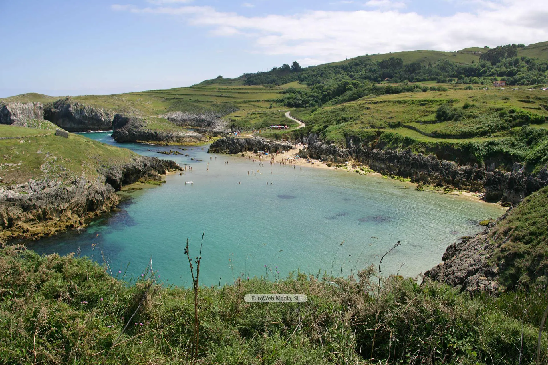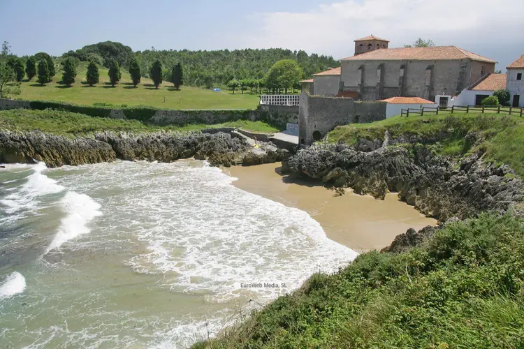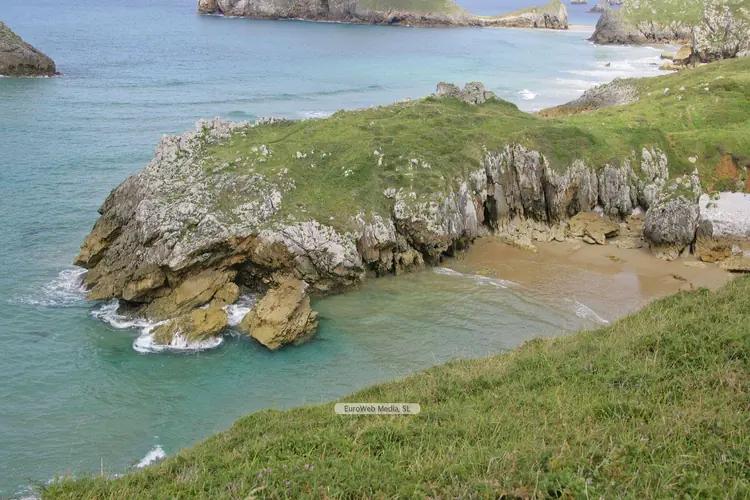 Playas | Llanes | Conocida por Playa de Cue pero también como Playa de Antilles, Playa Los Canales o Playa Salmoriera de Cué debido a las características del arenal donde cierta zonas tienen nombre propio pero desconocido para la mayoría excepto los lugareños. La playa de Cue asume la tipología de una concha con tómbolo, enlazada a la Islona o isla Grande por medio de una franja de arena. Cuando la marea está baja, se torna