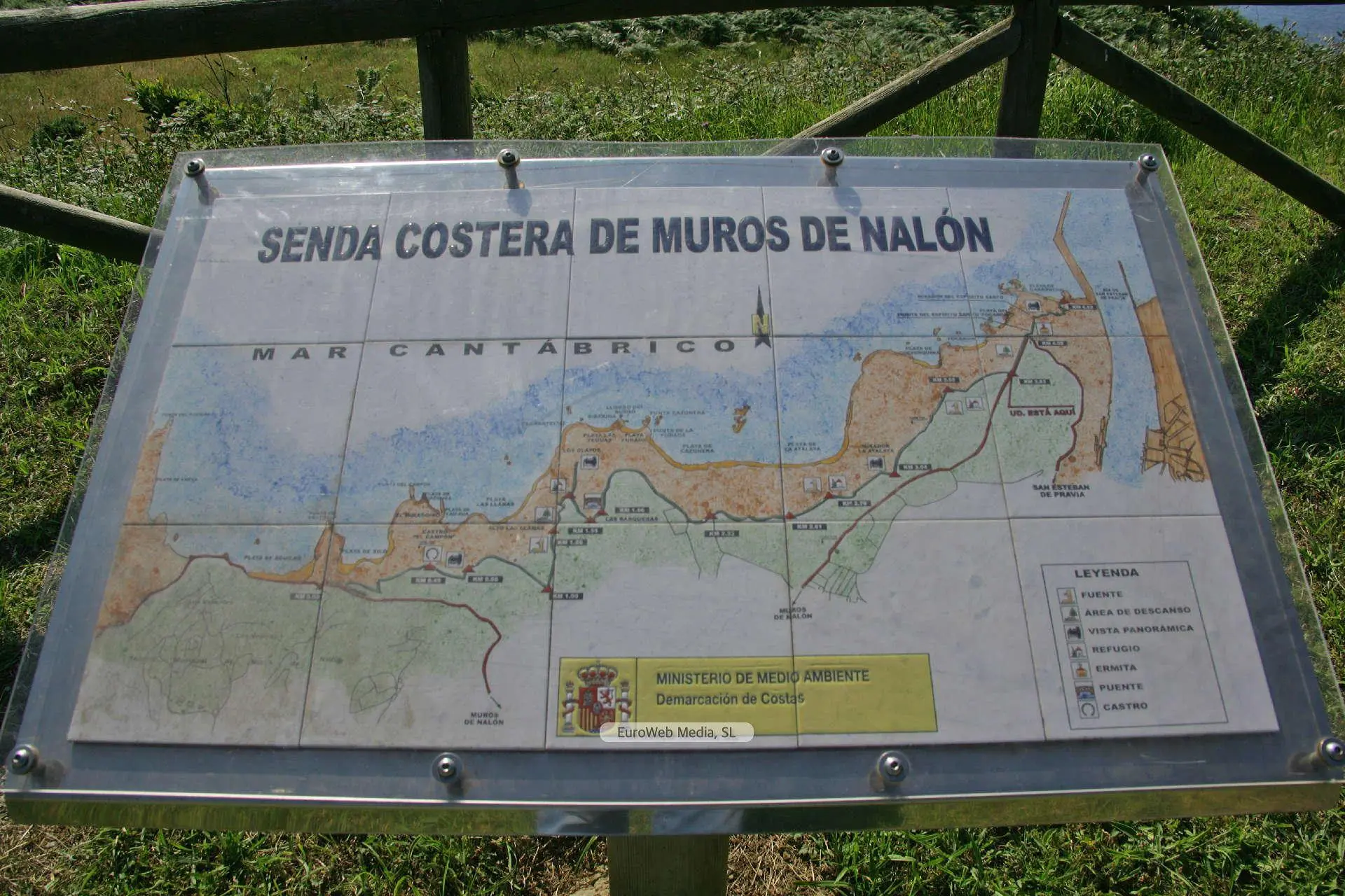 Rutas en Asturias | Muros de Nalón | Esta ruta está calificada como «Rutas de senderismo». Características: La senda tiene una anchura de unos 1,5 a 3 metros y el suelo es de cemento con losas irregulares de arenisca cuarcítica y en ciertos sitios travesaños de madera, se encuentran a lo largo del recorrido áreas de descanso con mesas y bancos para comer y/o descansar, cobertizos con bancos para protegerse en casos de lluvia, fuentes de agua potabl